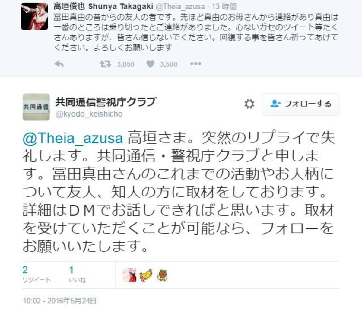 心ないガセのツイート等たくさんありますが 冨田真由さんの容体について元ジャニーズjr の高垣俊也さんがツイート 16年5月24日 エキサイトニュース